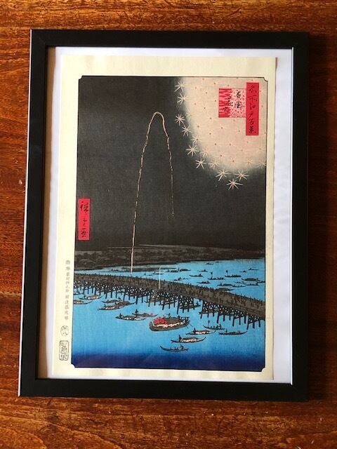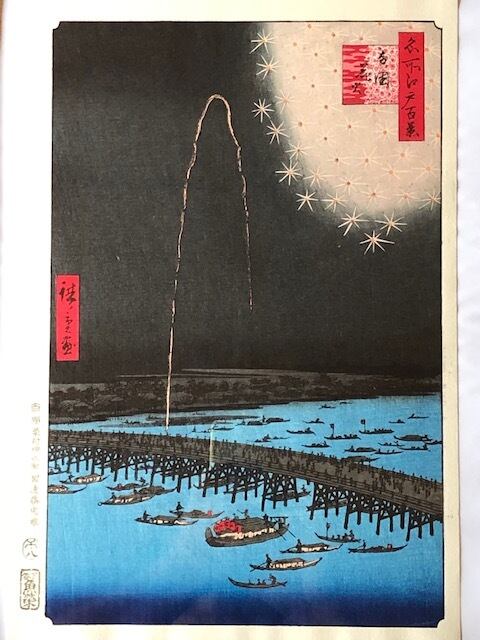 夏の風物詩の江戸の花火、夜の暗闇、川の濃いブルーに夜空に光る花火、とても