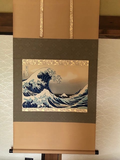 昭和の復刻版画を、掛け軸用に、丁寧に貼り付け、加工してあります。